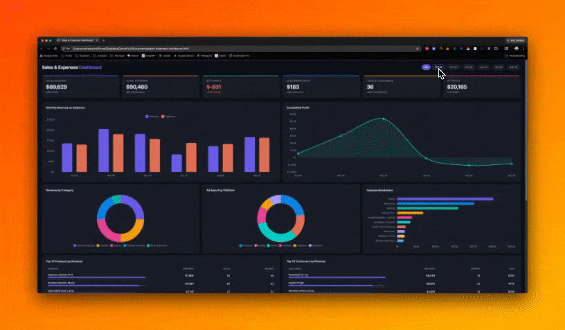Charts showing revenue by month and expense breakdowns by category. A sortable table of your top products. Filters you can click to drill into specific months or categories, and summary stats at the top showing total revenue, total expenses, and the net.