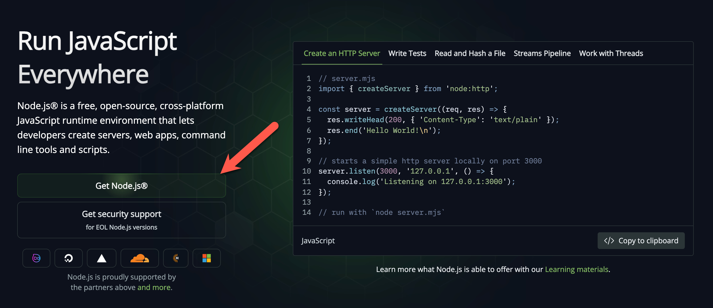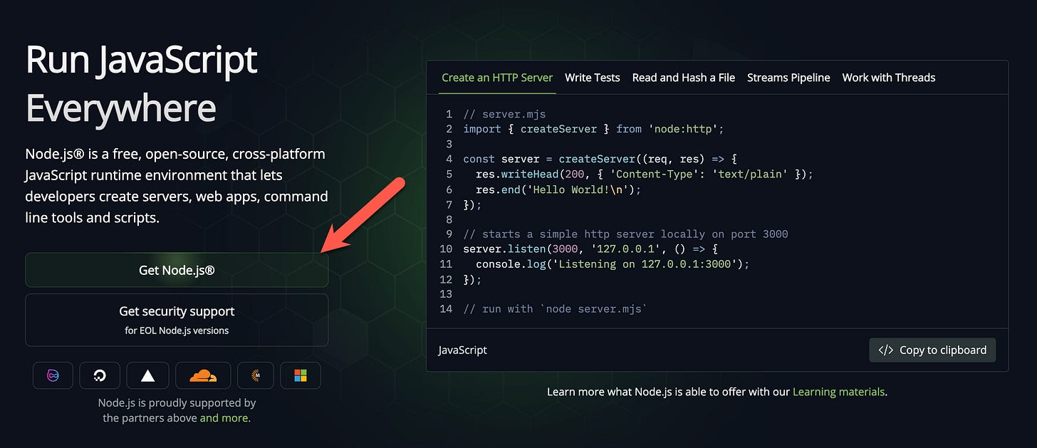 Go to nodejs.org. You’ll see a big green button that says “Get Node.js”. Click it, run the installer, click through the prompts.