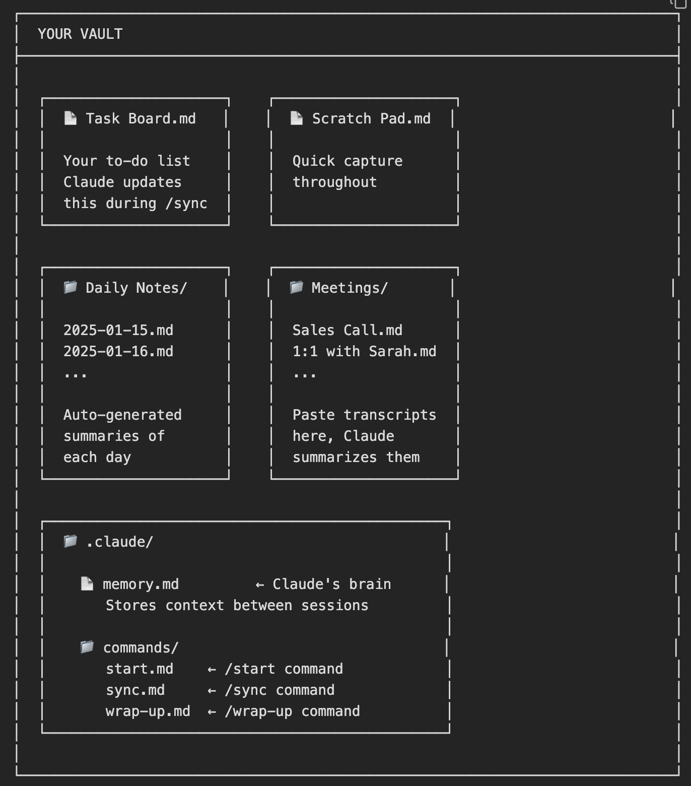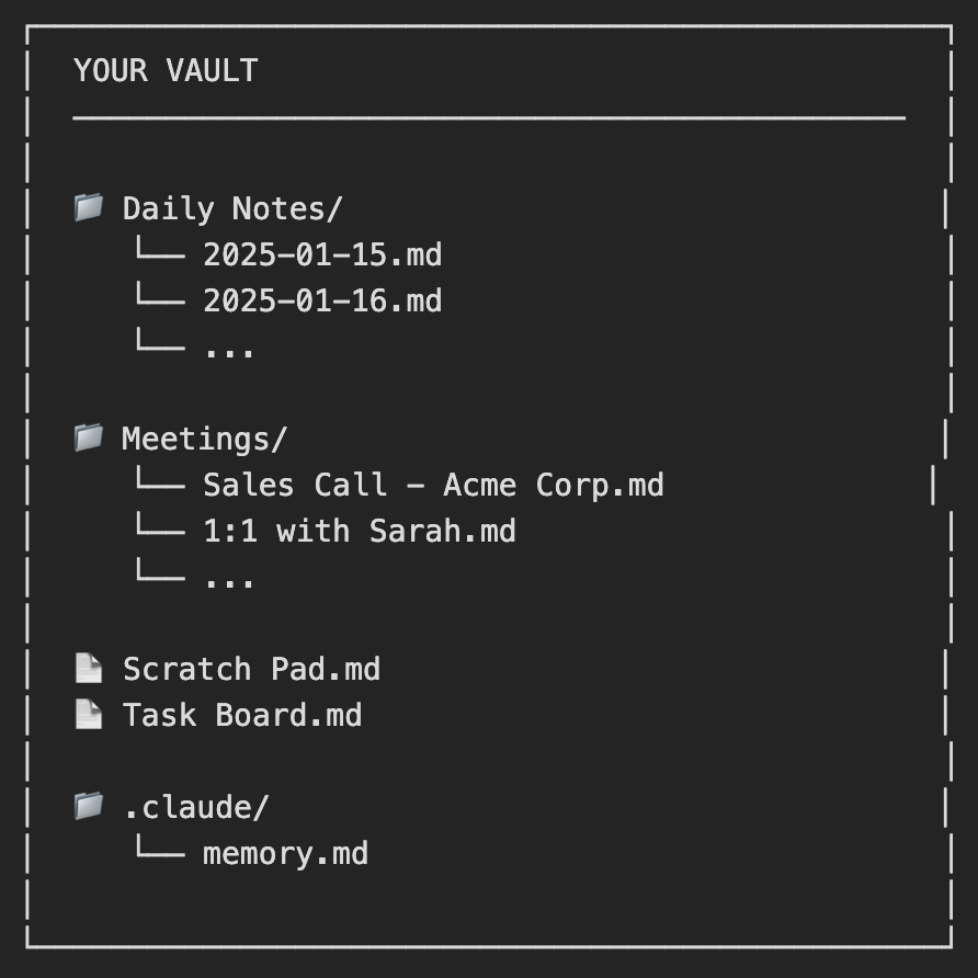 The notes are a scratch pad for quick capture, and a task list. The folders hold daily notes and meetings. The memory file is where Claude maintains working context over time, so it remembers what matters from one day to the next.