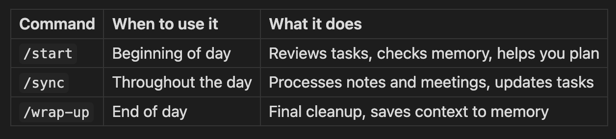 These are starting points. As you use them, you’ll want to tweak things. Maybe you want /start to pull in your calendar. Maybe /sync should also check your email folder. Ask Claude to update the command, it’s all text files.