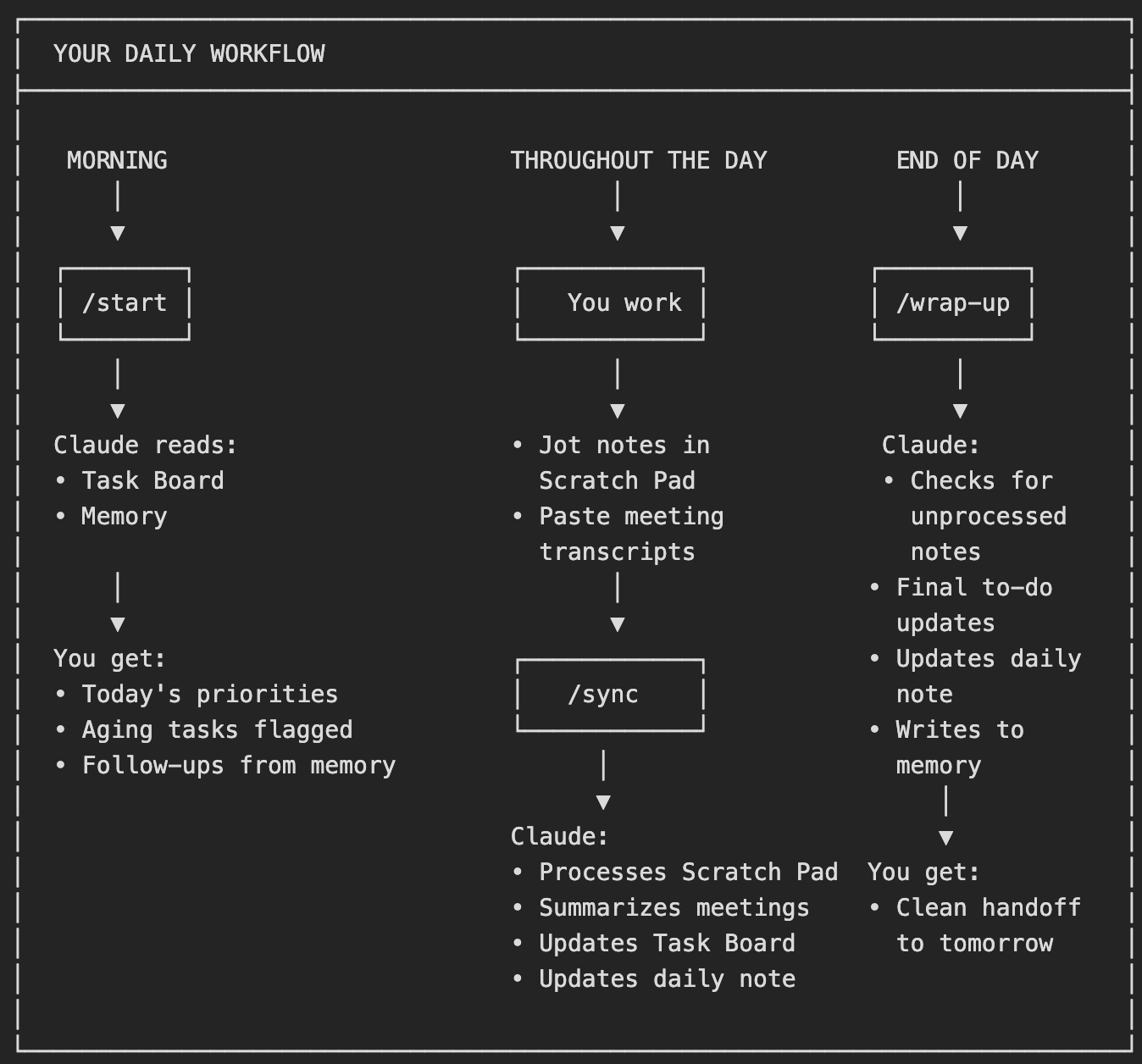 When I run /wrap-up at the end of the day, Claude checks for any unprocessed meetings, reviews my to-do list and scratchpad one more time, and writes to memory for continuity. Tomorrow’s /start will pick up right where today left off.