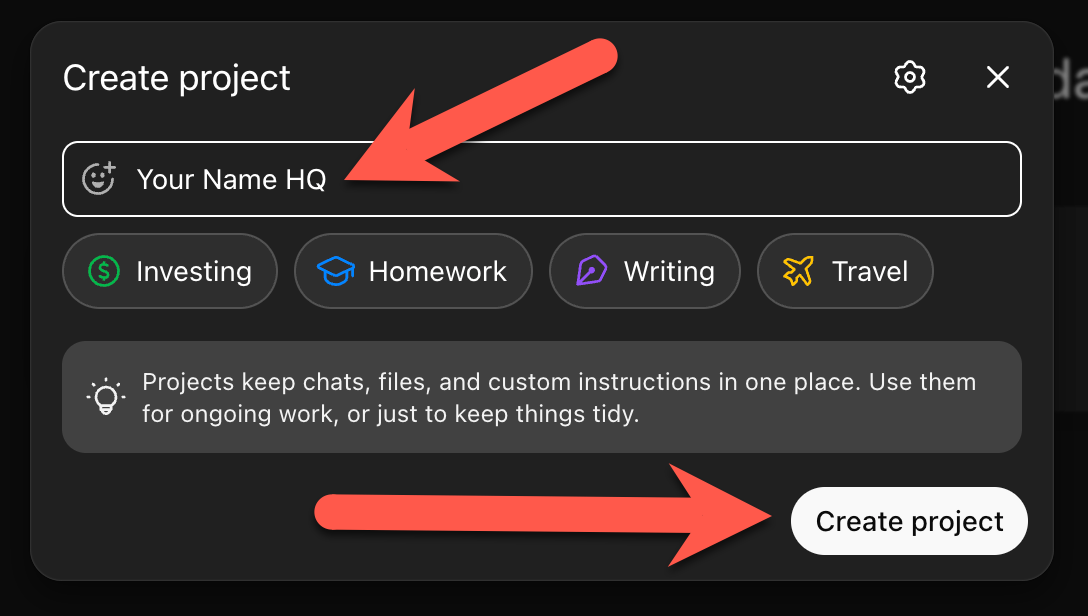 Name it YourNameHQ (or whatever you want... John Doe HQ, Sarah Smith HQ, you get the idea). Click Create Project.