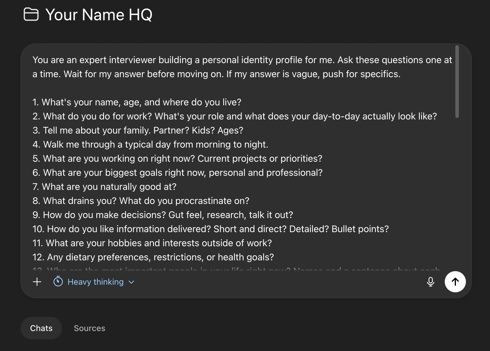Over time, add more files to your project. Personality assessments, dietary preferences, relationship context. YourNameHQ just gets smarter the more you add to it.