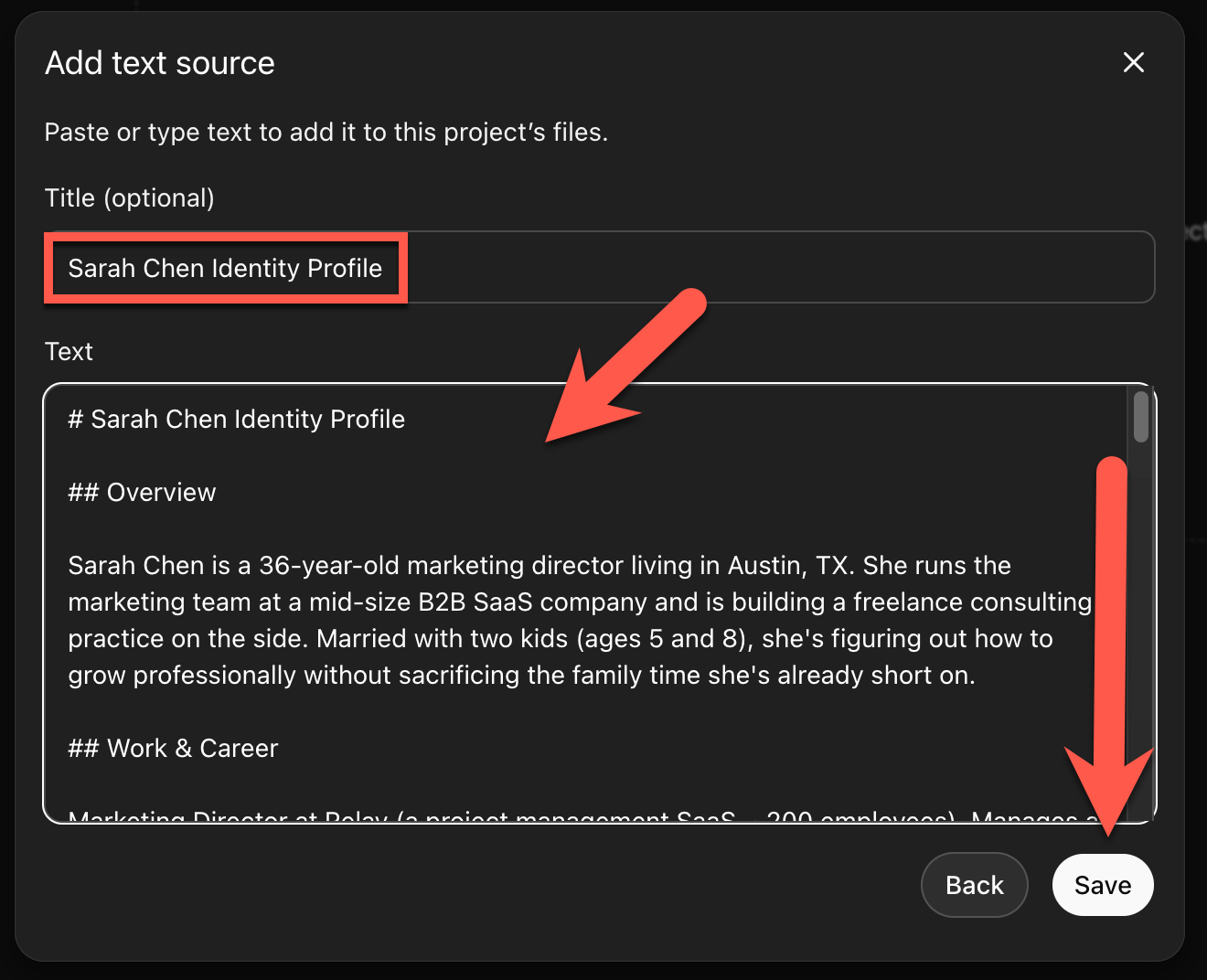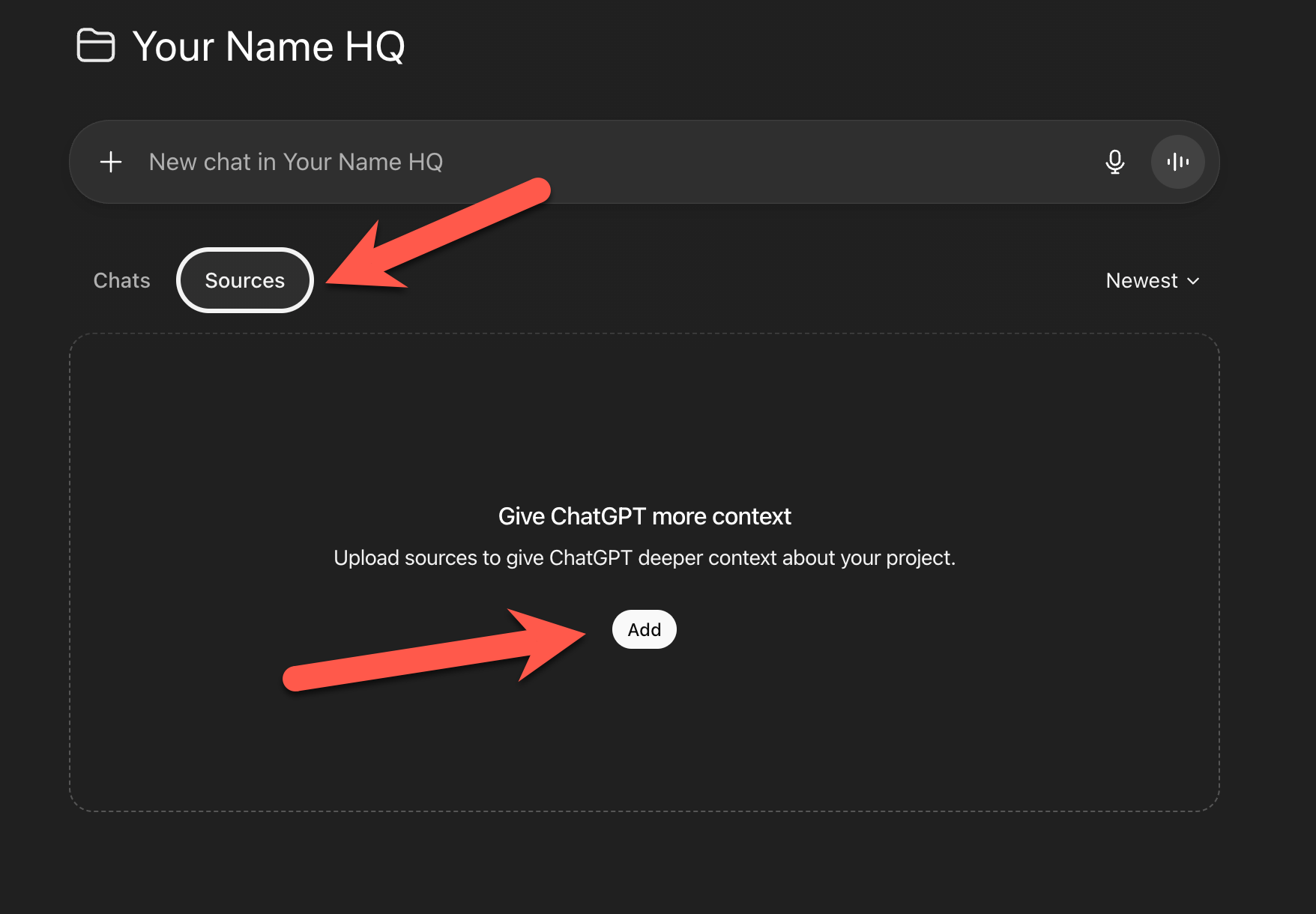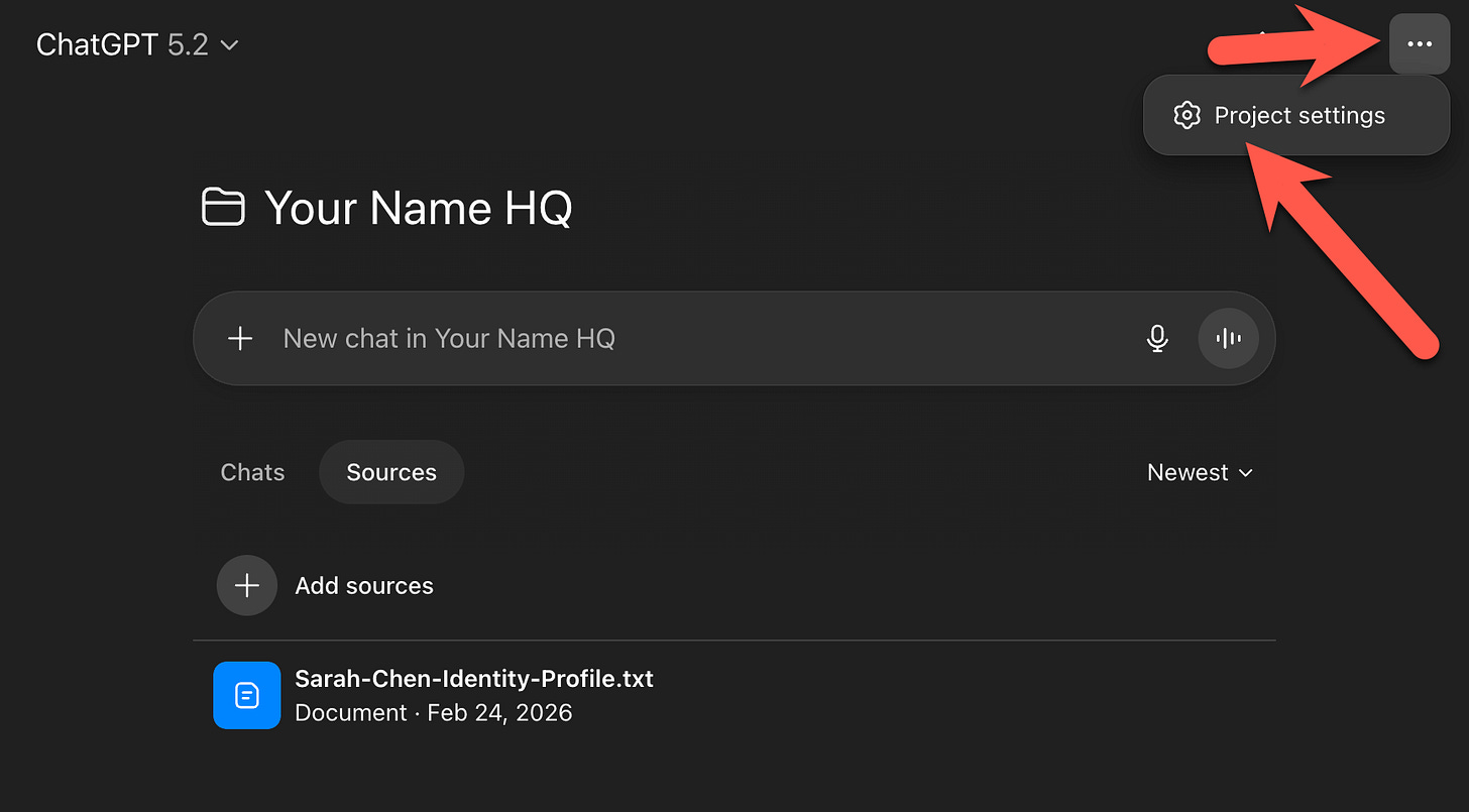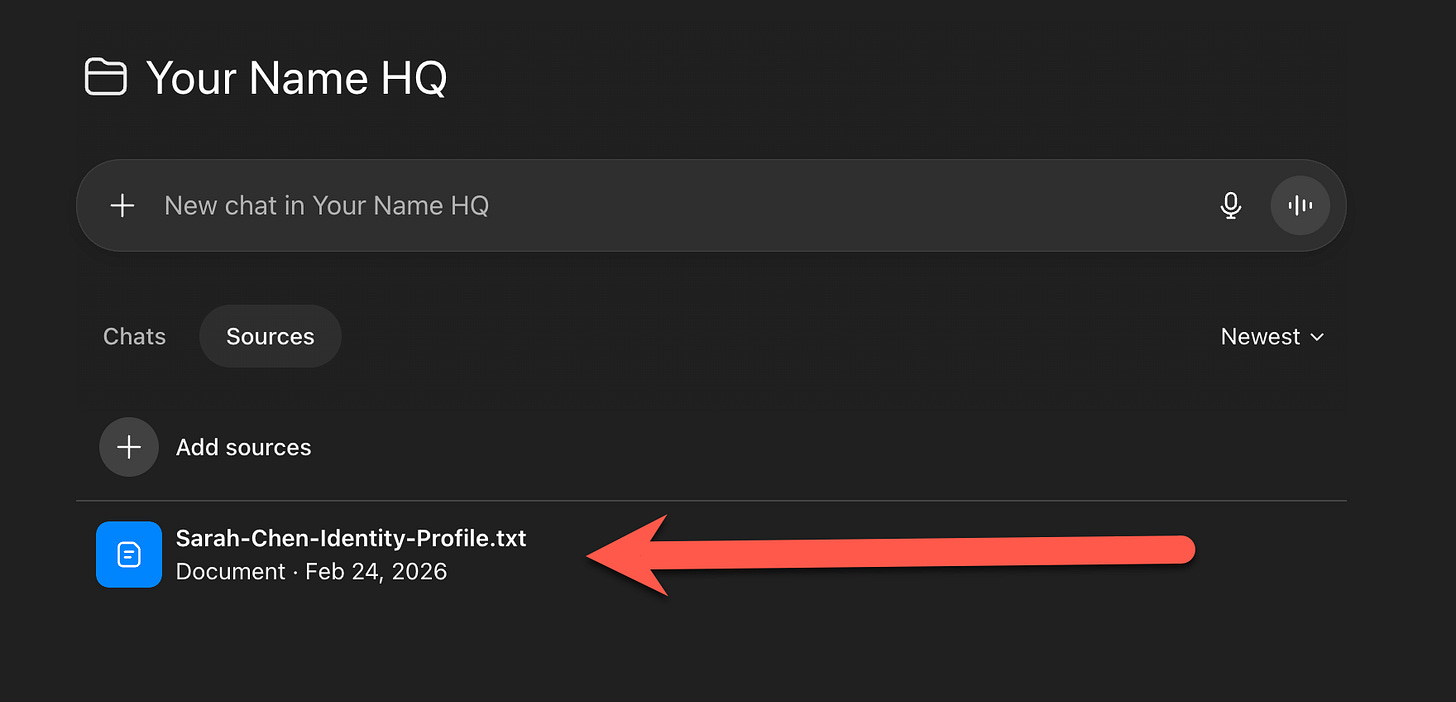 Copy the identity profile. Name it exactly as the prompt titled it (e.g., “Michael Crist Identity Profile”) so the custom instructions can find it. Inside your project, click Sources, then Add.