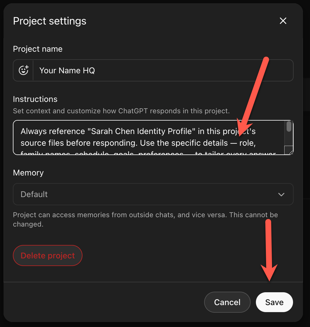 Click Project Settings. Paste the custom instructions from the interview output into the Instructions field. Click Save.